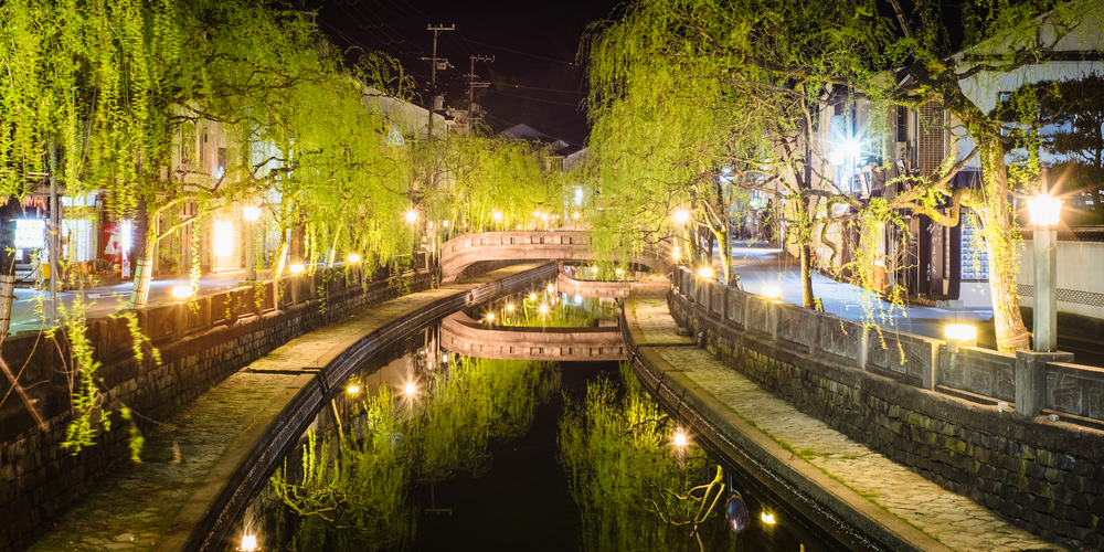 両岸には情緒あふれる和風旅館や個性的な外観の建物などが並びます。