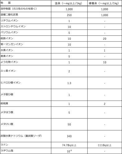 環境省自然環境局の鉱泉分析法指針では、療養泉を次のように分類してい